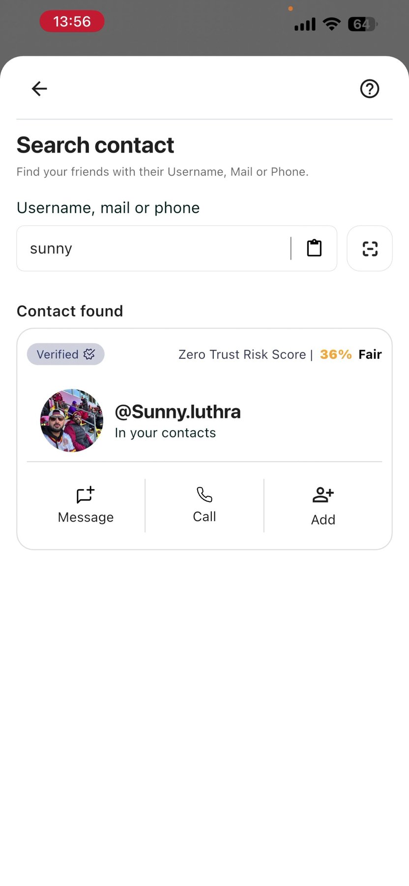 View contact profile: Tap their name to see verification level, ZTRS score, and zone
